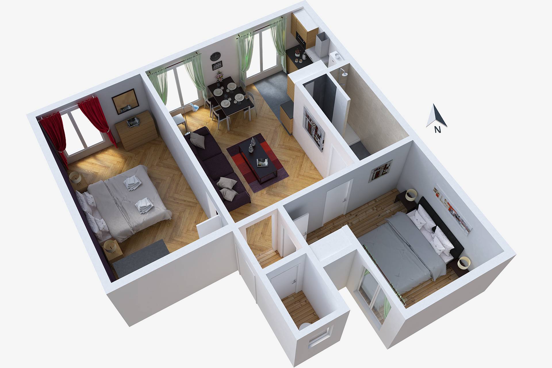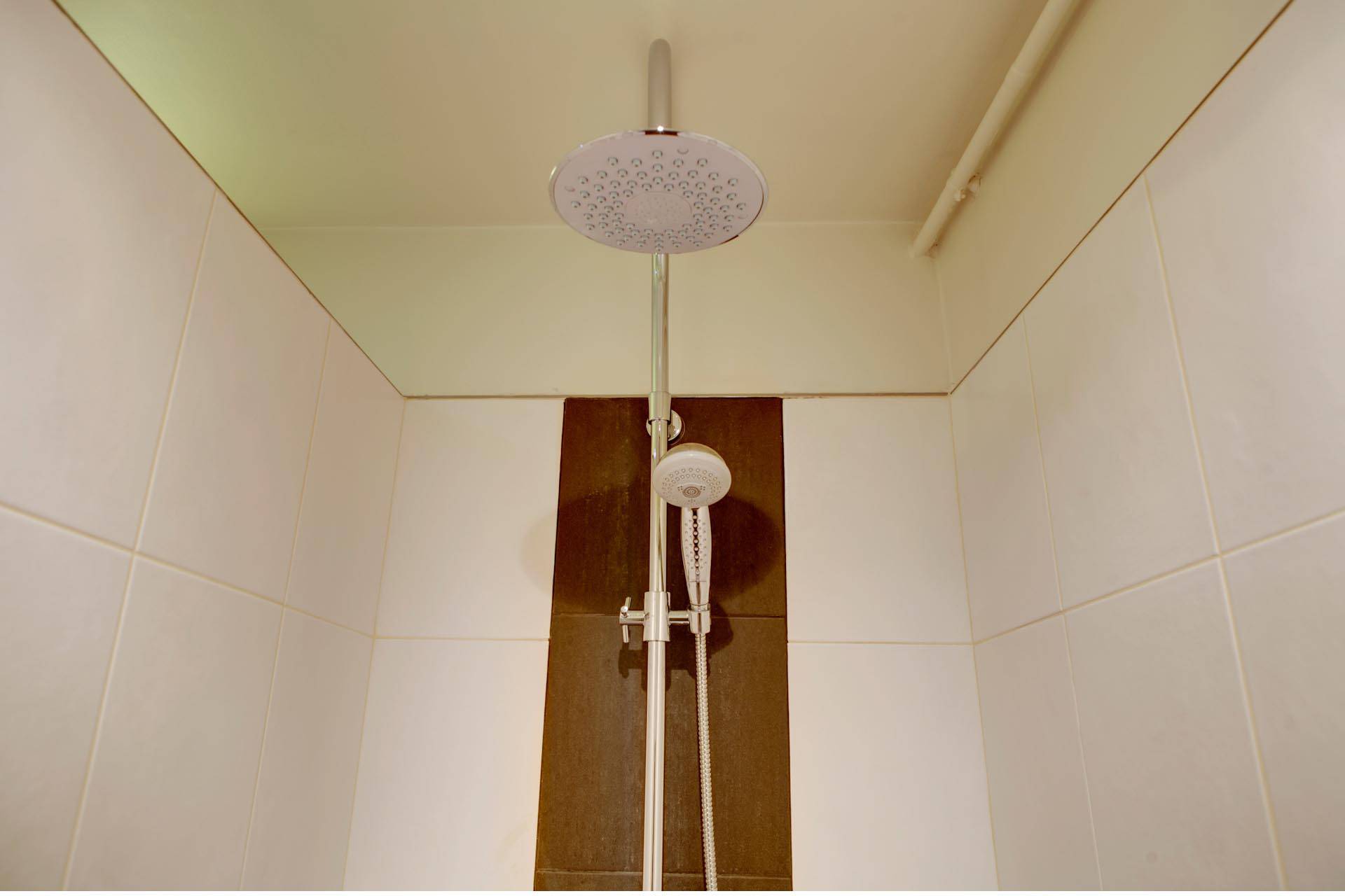 La petite entrée de l’appartement joue le rôle de préambule puisqu’elle débouche vers trois différents accès. La porte qui fait front conduit au premier espace sommeil du bien, la décoration est moderne et sobre s’associe à des couleurs pâles feutrées. La porte gauche dessert la pièce à vivre composée d’un coin canapé détente, d’une cuisine totalement équipée et ouverte sur une table à manger dressée. Attenant au salon on découvre l’espace de douche du lieu.